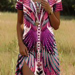 De Julia Levendige Boho Chic Jurk is ontworpen om een statement te maken terwijl je moeiteloos comfortabel blijft. Met zijn opvallende print en flatterende pasvorm is deze jurk perfect voor stranddagen, festivals of casual uitjes. De lichte, vloeiende stof laat je vrij bewegen en trekt overal de aandacht.