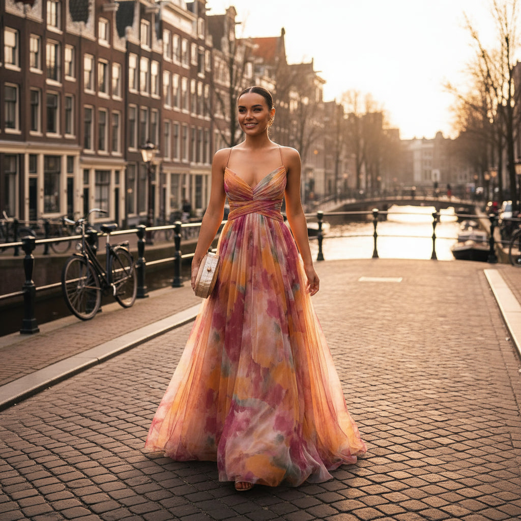 Stap in een wereld van charme en elegantie met de Giselle-jurk, waar kunstzinnige prints en zomerse verfijning samenkomen. Deze vloeiende maxi-jurk omhult uw figuur op een gracieuze manier en straalt moeiteloze klasse uit. Perfect voor tuinfeesten, bruiloften of avondgelegenheden, deze jurk zorgt ervoor dat u schittert met een tijdloze en verfijnde look.