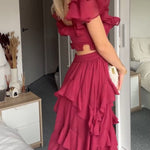 De Isabella Romantische Cascade Ruffle Jurk is dé eyecatcher voor onvergetelijke momenten. Met sierlijke ruches, een flatterende halslijn en een vloeiend silhouet straalt deze jurk romantiek en klasse uit. Perfect voor bruiloften, feestjes of een diner – dit is een jurk die altijd indruk maakt.