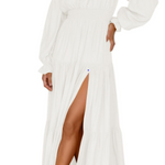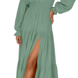 Vloeiende Beweging – De gelaagde maxi-rok valt elegant bij elke stap.