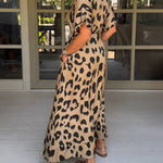 Laat je van je meest stijlvolle kant zien met deze elegante maxi-jurk in luipaardprint. Het lichte, ademende materiaal zorgt voor ultiem comfort, terwijl de flatterende V-hals en soepele pasvorm je silhouet prachtig laten uitkomen. Perfect voor vrouwen die moeiteloze klasse willen uitstralen met een speelse, wilde touch.