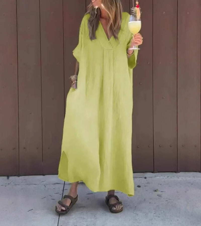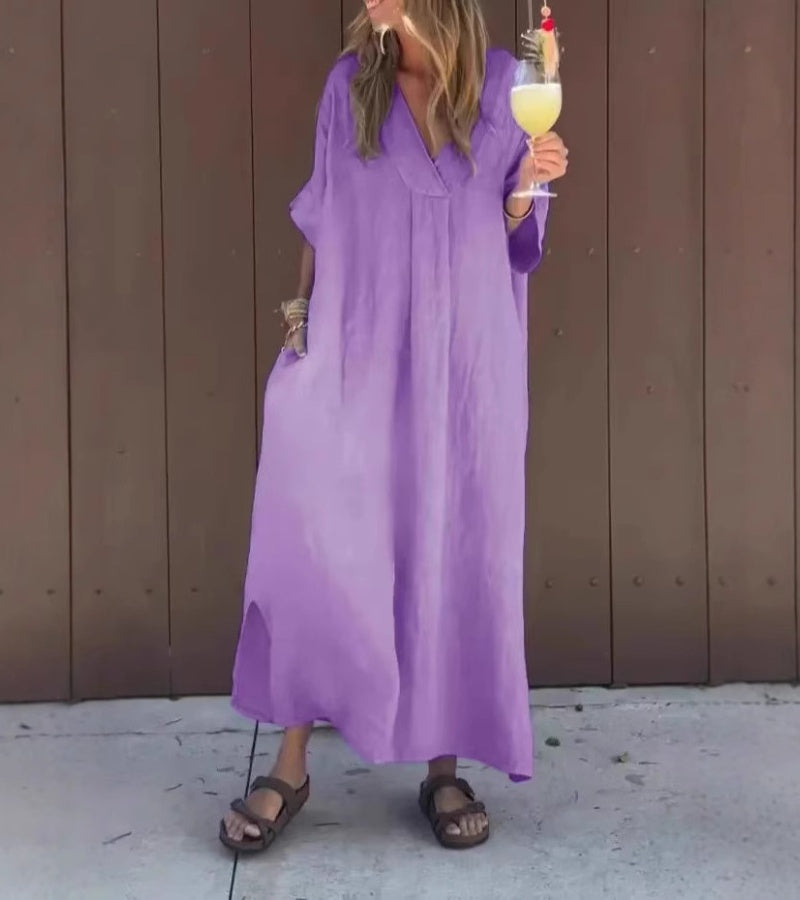 - Uitlopende snit en vloeiende silhouet: Past zich aan zonder te knellen, perfect voor elke lichaamsvorm, voor een elegante look in alle eenvoud.