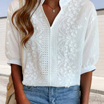 Met deze casual blouse met V-hals bent u moeiteloos stijlvol. Het heeft pofmouwen en delicate kantpatchwork. Het is gemaakt van een comfortabele katoenmix en perfect voor zomerdagen.