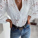 Zet stijlvolle accenten met de Roselina geborduurde blouse met lange mouwen, die vrouwelijke verfijning en flatterend comfort combineert. Het fijne opengewerkte patroon en het liefdevol aangebrachte borduurwerk geven elke look een zachte elegantie. Of het nu voor ontspannen middagen of speciale gelegenheden is – deze veelzijdige blouse is een echte allrounder.