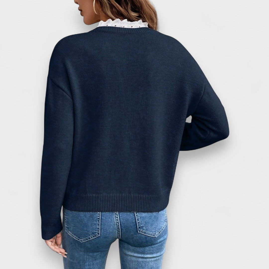Marineblauwe trui met wit kanten detail bij de halslijn, ontworpen om een romantisch en verfijnd tintje aan je dagelijkse stijl toe te voegen. Een veelzijdig kledingstuk dat comfort en vrouwelijkheid combineert.