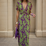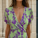 Ontdek Brans Arja™, een midi-jurk die elegantie en comfort perfect combineert. De frisse groene en diepe paarse bloemenprint maakt elke look bijzonder. Met een flatterende V-hals, speelse ruffle mouwen en tijdloos silhouet. Stijlvol met hakken of casual met sneakers – geschikt voor elke gelegenheid!