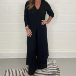 Moeiteloze Stijl – De lange blouse voegt een vleugje verfijning toe, terwijl de luchtige broek zorgt voor ultieme bewegingsvrijheid.