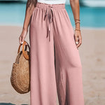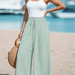 Ervaar ultiem comfort en moeiteloze elegantie met deze stijlvolle wijde broek. De luchtige stof en de flatterende hoge taille zorgen voor een verfijnde look, terwijl de elastische band met strikdetail zorgt voor een perfecte pasvorm. Ideaal voor elke gelegenheid, van een ontspannen stranddag tot een chique citytrip.