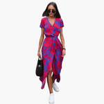Deze prachtige wikkeljurk is ontworpen om je schoonheid te benadrukken en combineert verfijning en comfort. De flatterende snit benadrukt je figuur, terwijl het vloeiende silhouet sierlijk wiegt bij elke stap. Of het nu voor een casual uitje is of voor een speciaal evenement, met deze jurk voel je je helemaal op je gemak.